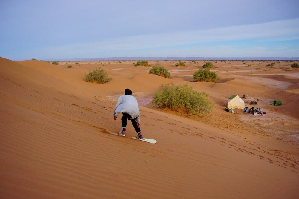 Erg Chebbi (near Merzouga): Morocco’s most famous dunes, reaching heights of 150 meters. They’re ideal for beginners and experienced sandboarders alike.